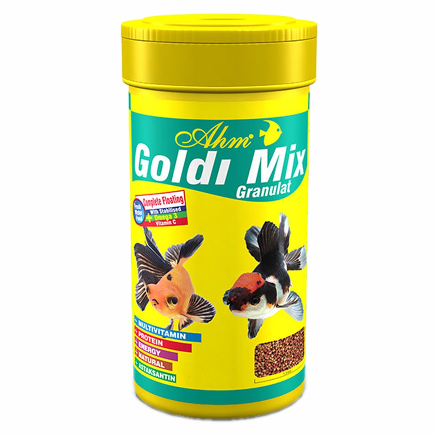 AHM Goldi Mix Granulat 100 ml. Üç farklı yemden oluşan Goldi Mix doğru beslenme açısından önemli bir yemdir. Enerji ve vitamin yönünden zengin,sağlıklı ve dengeli beslenme olanağı sağlar. Japon balıkları için üretilmiş granül formda balık yemidir. Akvaryumda beslenen japon balıkları için temel yemdir. Sindirimi kolaydır. Balık sayısına göre dozajlı kullanım halinde su kirliğine neden olmaz. Kullanım Şekli: Balıklarınıza günde 3 defa ortalama 2-3 dakikada tüketebilecekleri kadar veriniz.