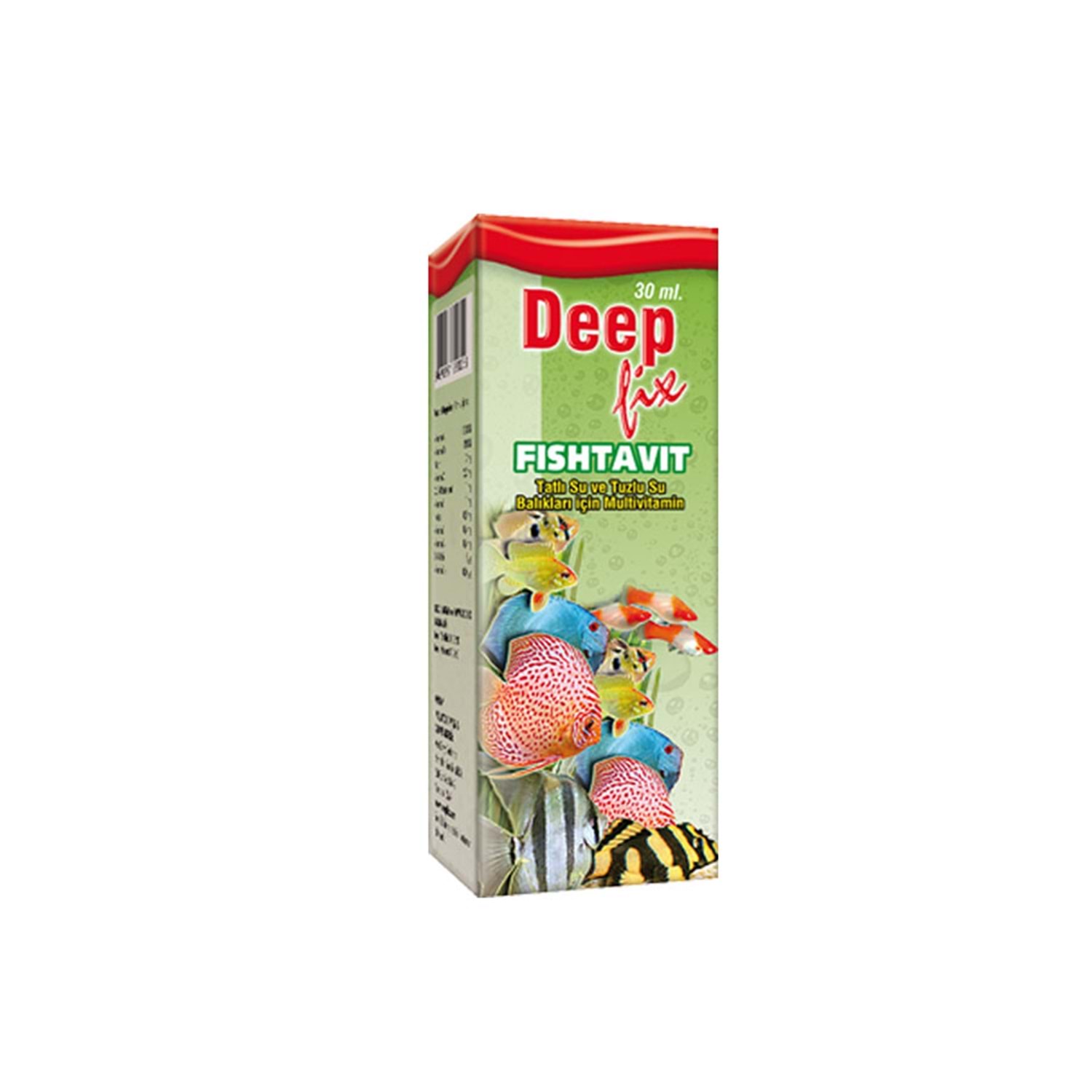 DeepFix Fishtavit Balık Vitamini 30 ml. Tatlı su balıkları için, vitamin solüsyonudur. Balıkların yemlerini vitamin bakımından zenginleştirir. Damızlık verimini arttırır. Yavruların büyümelerini hızlandırır. Stresi gidermektedir. Hastalık sırasında ve sonrasında direnci arttırmak amacıyla güvenle kullanılır. Kullanım Şekli Ve Dozu: Her 50 litre akvaryum suyu için 6 - 7 damla yemin üzerine damlatınız. Doğal ortam hazırlamak için her 50 litre akvaryum suyuna gün aşırı 5 - 6 damla damlatınız