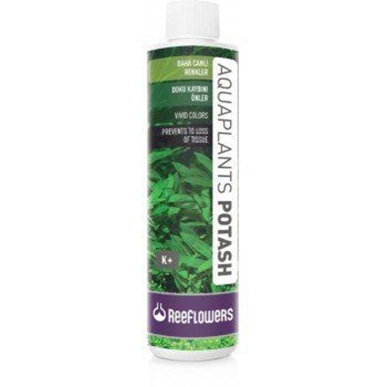 ReeFlowers AquaPlants Potash 500 Ml. DOKU KAYBINI ÖNLER DAHA PARLAK YAPRAKLAR ReeFlowers AquaPlants Potash, yüksek yoğunlukta potasyum çözeltisidir. Bitkili akvaryumlar için özel olarak formüle edilmiştir. 1 lt’de en az 40.000 ppm potasyum içerir. Potasyum bitki gelişimi ve sağlığı için en önemli elementlerdendir. Fotosentezde kullanılır ve bitki dokularında gerçekleşen birçok biyokimyasal reaksiyon için oldukça önemlidir. Büyümeyi hızlandırır, kök gelişiminde etkilidir. Potasyum eksikliği bitkilerde yaprak renklerinde solmalara, genellikle dış kenar kısımlardan başlamak kaydıyla doku çürümelerine ve eksiklik giderilmediği taktirde yeterli klorofil üretilememesi sonucu ölümlere sebep olur. Bitkili akvaryumlarda potasyum 20-30 ppm aralığında tutulmalıdır. KULLANIM TALİMATI Ortalama yükteki bir bitkili tatlı su akvaryumu için 100 lt’ye günlük 1 ml kullanılması tavsiye edilir. 1 ml çözelti 100 lt'de 0,40 ppm artış sağlar. 85 ml ambalajda 20 damla = 1 ml 250 ml, 500 ml ve 1000 ml ambalajlarda 1 kapak = 6 ml