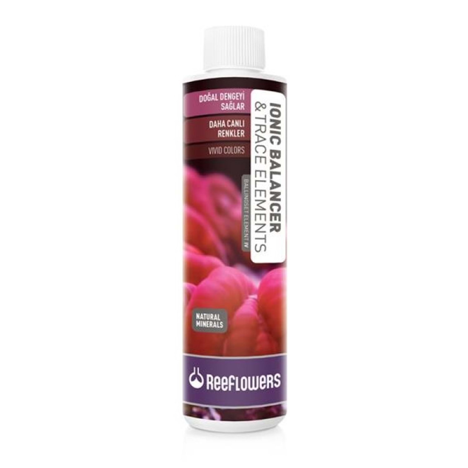 ReeFlowers Ionic Balancer & Trace Elements - BallingSet Element 4 250 Ml. ReeFlowers Ionic Balancer & Trace Elements – Balling Set Element 4, iyonik denge sağlayıcı elementleri ve deniz suyunda eser miktarda bulunan elementleri içerir. Deniz suyunda bir çok eser element bulunur ve bu elementler, mercanlar, balıklar ve suda yaşayan tüm canlılar tarafından sürekli olarak tüketilir. Canlıların sağlıklı kalabilmesi ve canlı renklere sahip olabilmesi için bu elementlerin düzenli olarak eklenmesi gereklidir. Her akvaryumda tüketim oranları farklıdır. Kalsiyum tüketimi periyodik testler yapılarak tespit edildikten sonra 100 lt'lik bir akvaryumda 3 ppm kalsiyum tüketimi için 2 ml Ionic Balancer & Trace Elements çözeltisi eklenmelidir. Balling metodu uyguluyorsanız eklediğiniz Calcium Blend - BallingSet Element 2 çözeltisi kadar iyonik denge sağlayıcı eser element çözeltisi ekleyiniz. 100 lt için günlük 10 ml'den fazla çözeltiye ihtiyaç duyuluyorsa ekleme işleminin dozaj pompası ile güne yayarak yapılması tavsiye olunur.