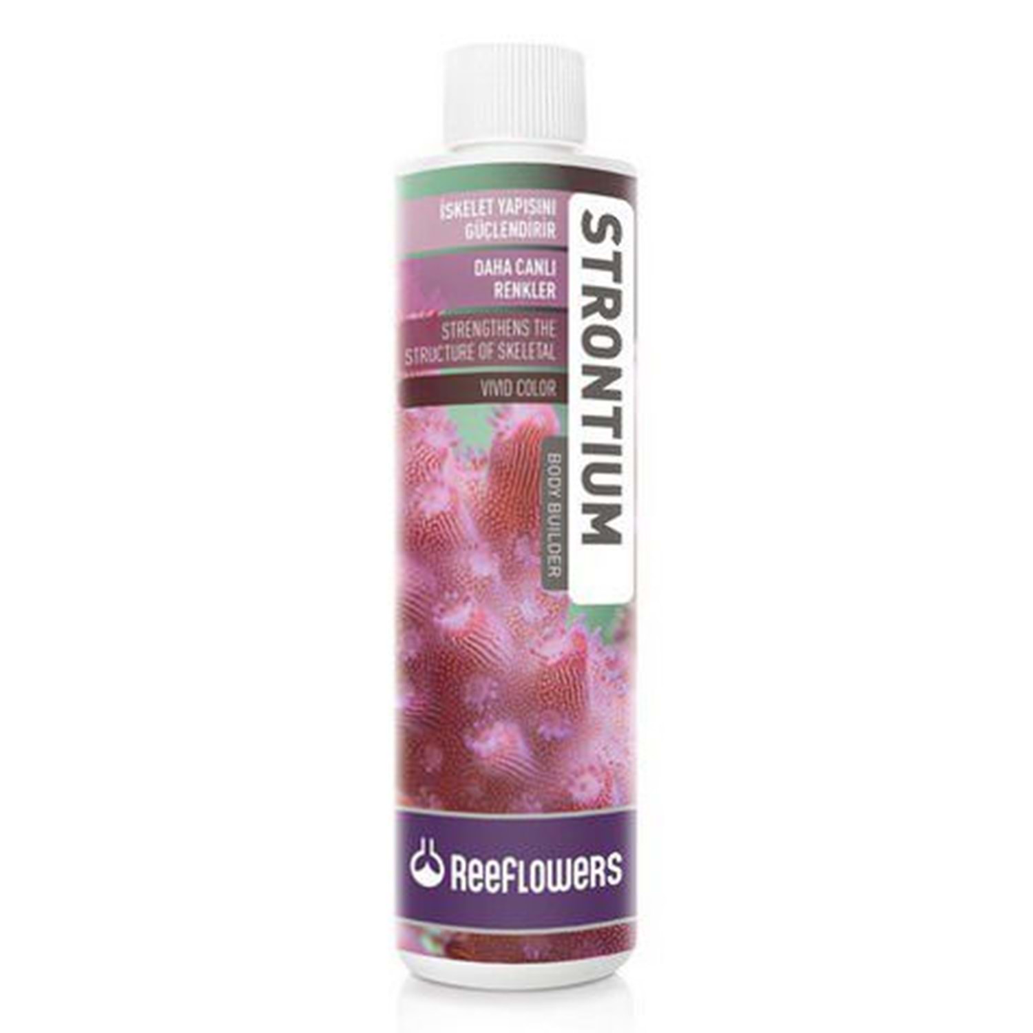 Reeflowers Strontium Blend Body Builders 250 ML - İSKELET YAPISINI GÜÇLENDİRİR - DAHA CANLI RENKLER ReeFlowers Strontium, yüksek yoğunlukta iyonik stronsiyum çözeltisidir. Stronsiyum, mercan, balık ve omurgasız canlı iskeletlerinde bulunur. Mercan iskeletinin yaklaşık %1 ini oluşturur. ReeFlowers Strontium, 1 lt de en az 30.000 ppm stronsiyum içerir. Stronsiyum, diğer iyonları inorganik çökelti haline getirerek iskelet oluşumunu, dolayısıyla büyümeyi sağlar, güçlü bağ yapısı sayesinde iskeleti sağlamlaştırır. Eksikliği renklerde matlaşma ve iskelet yapısında zayıflamaya sebep olur. Kullanım Talimatı Her akvaryumda stronsiyum tüketim oranları farklıdır. Ortalama olarak stronsiyum tüketiminin kalsiyum tüketimine oranı %1 dir. Kalsiyum tüketimi periyodik testler yapılarak tespit edildikten sonra 30 ppm kalsiyum tüketimi için 100 lt lik bir akvaryuma 1 ml 'Strontium - Body Builder' çözeltisi eklenmelidir (1 kapak = ~ 6 ml).