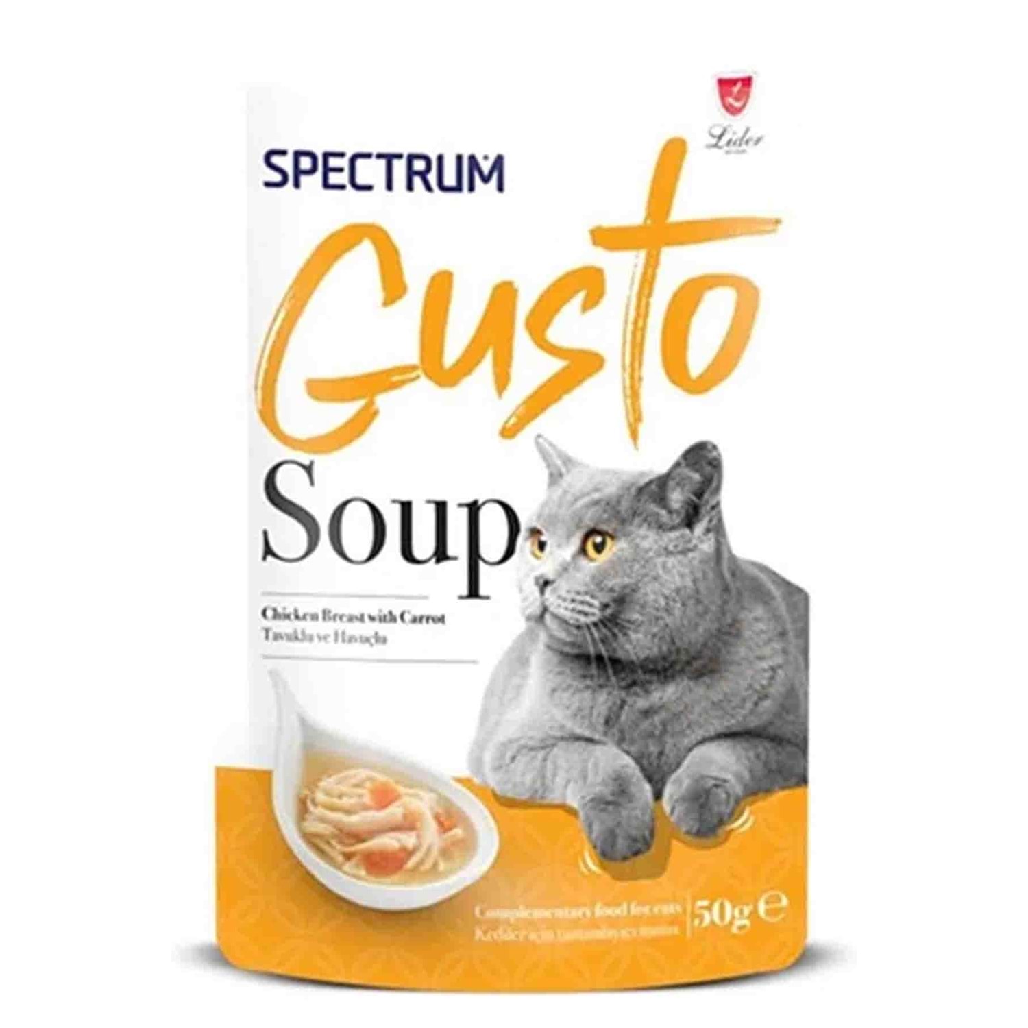 Spectrum Gusto Tavuklu ve Havuçlu Çorba 50gr Çorba, tamamlayıcı mama olarak veya günlük ödül olarak verilebilir. Kaşık kullanarak ufak miktarlarda birkaç seferde verebilirsiniz. Kediniz için sürekli taze içme suyu bulundurun. Paket üzerindeki baskıya bakınız. İçindekiler: Su, Tavuk göğüs eti 25,40%, Havuç 4,7%, Balık suyu, Doğal kıvam verici (Tapyoka nişastası (E1442), Guar sakızı (E412)). Besin Değerleri: Ham Protein 8%, Ham Yağ 0,2%, Ham Kül 1%, Ham Selüloz (Lif) 0,1%, Nem 90%.