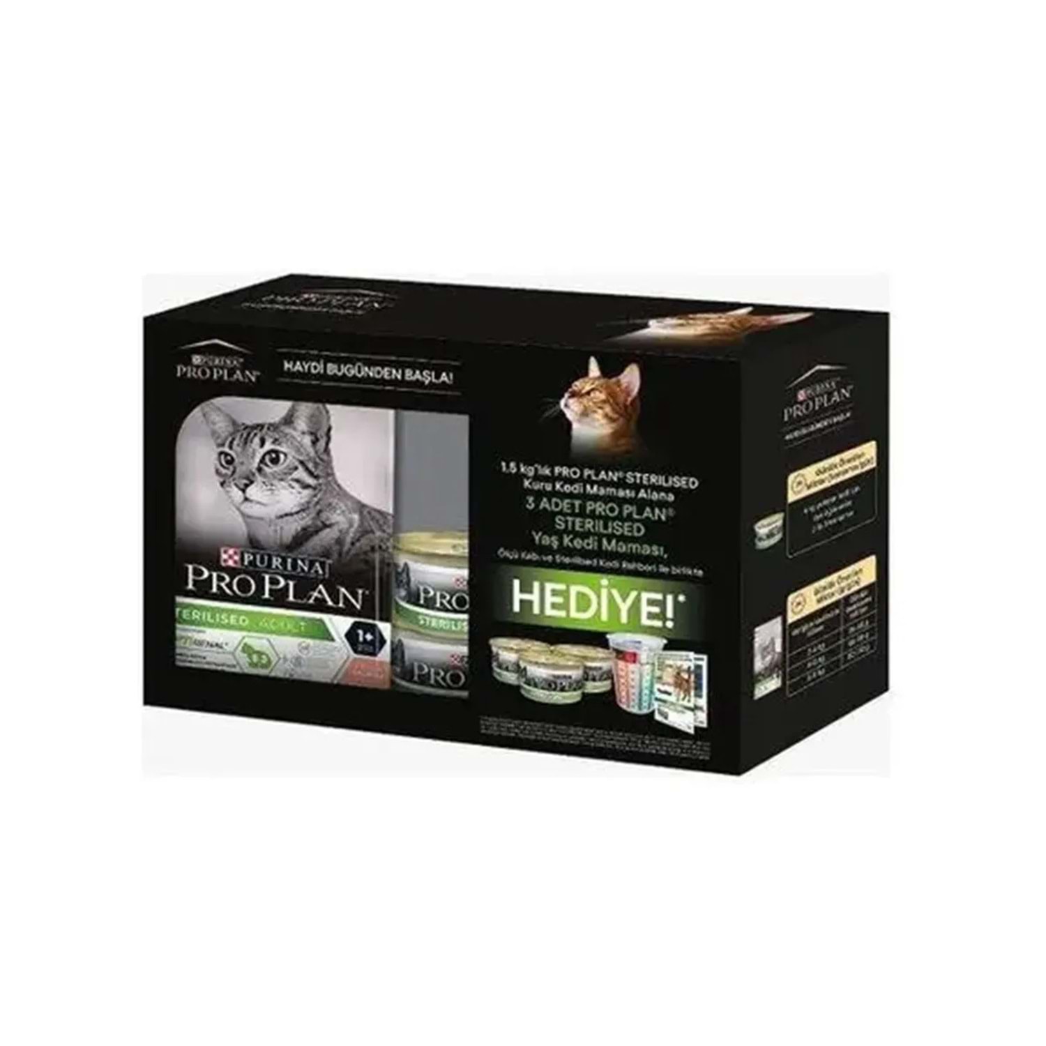 Proplan Hediye Paketi Kısırlaştırılmış Somonlu Kedi Maması 1.5 Kg + 3 Adet Yaş Mama + Ölçü Kabı * 1 adet ProPlan Optirenal Somonlu Ve Pirinçli 1,5 kg'lık kuru mama, * 3 adet Proplan Sterised 85 gr okyanus balıklı konserve mama, * Mama ölçü kabı bulunmaktadır. Proplan Somonlu kuru mama, kısırlaştırılmış genç ve yetişkin kediler için, özel olarak geliştirilmiş, azalan enerji ihtiyacına uygun olarak formüle edilmiş, yüksek sindirilebilirliğe sahip, kilo kontrollü, yetişkin kedi maması. * Omega 6 ve 3 gibi esansiyel yağ asitlerini sağlayan balık yağları ile daha sağlıklı deri ve parlak tüy oluşumunu destekler. * Artırılmış somon proteini ve sindirilebilirliği düşürülmüş karbonhidrat içeriği sayesinde fazla yağ depolama riskini azaltır. Optimum düzeyde ki çözünemeyen lif, glukoz emilim oranını düzenler. * Kalsiyum, fosfor, sodyum ve klorid gibi esansiyel minerallerin yardımı ile idrar pH'ının ideal 6.3 ve 6.6 aralığında olmasını sağlayarak daha etkin üriner sistem fonksiyonu sağlar, struvit ve oksalat taş oluşumu riskini azaltır. * Vitamin E, C, selenyum ve beta karoten ile daha güçlü antioksidan koruma sağlayarak bağışıklık sistemini destekler ve vücutta serbest radikallerin zararlı etkilerini hızla azaltır. * Kalsiyum içeriği sayesinde tartar ve plak oluşumunu önlemeye yardımcı olur. * Somondan gelen yüksek kalitedeki protein sayesinde antikor gelişimini artırır. * Böbrek sağlığının korunmasına yardımcı olur. Mamanın İçeriği; Somon balığı (% 20,00), mısır gluten unu, pirinç, kurutulmuş kanatlı proteini, mısır, balık yağı, buğday lifi, buğday gluten unu, kurutulmuş yumurta, mineraller, hayvansal yağ, sakatat, maya.