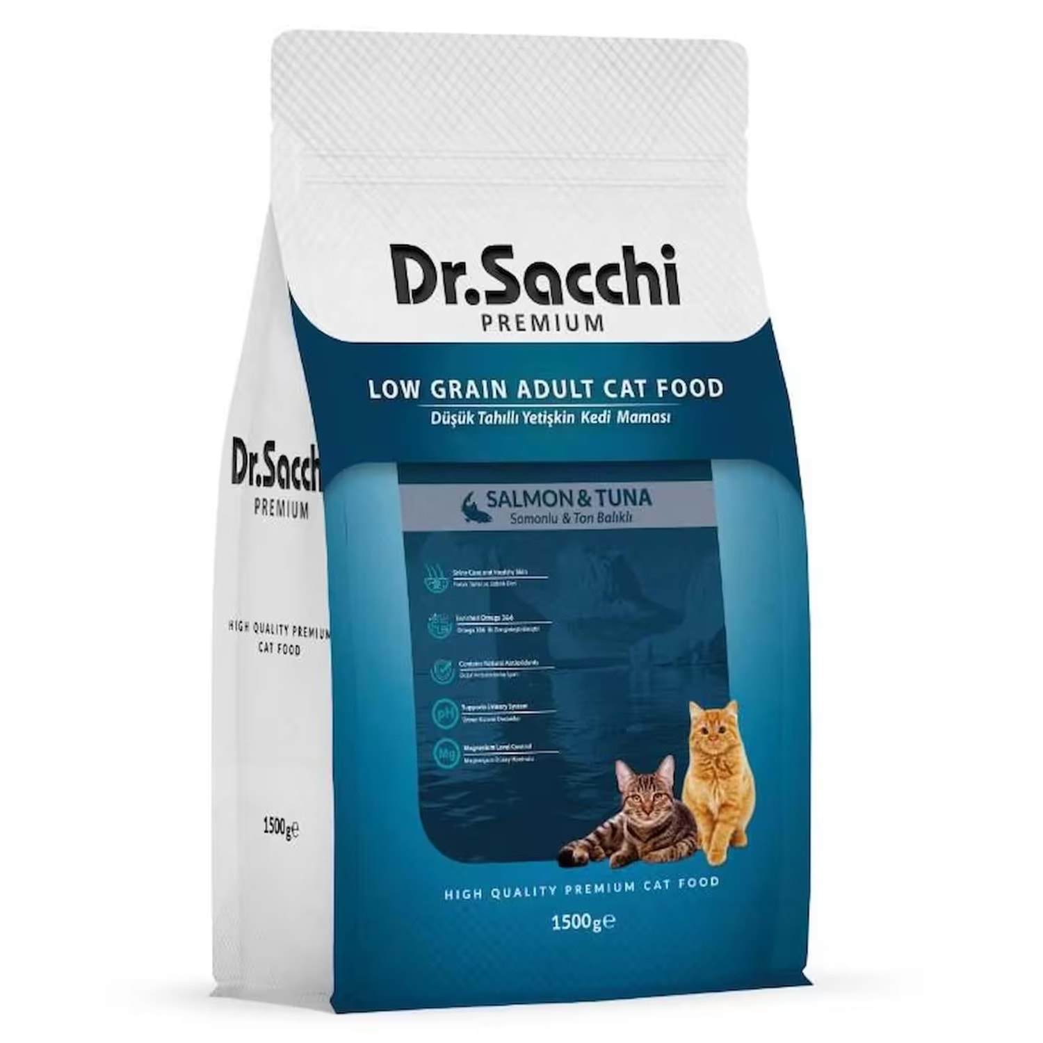 Dr.Sacchi Premium Düşük Tahıllı Somonlu ve Ton Balıklı Kedi Maması 1,5 Kg Dr.Sacchi Premium Düşük Tahıllı Somonlu ve Ton Balıklı Yetişkin Kedi Maması, 1 yaş ve üzeri kedilerinizin beslenmesinde optimum düzeyde fayda sağlar. İçeriklerimizde kullanılan yoğun ve yüksek kaliteli hayvansal proteinler kedinizi tüm yaşam evrelerinde güçlü ve sağlıklı kılar. Yapay tatlandırıcı, koruyucu ve renklendirici içermez. İçindekiler Yüksek kalitede kurutulmuş somon ve ton balığı, hayvansal proteinler, esmer pirinç, bezelye, patates, tavuk yağı, hidrolize tavuk ciğeri, nükleotit maya proteini, mineraller, deniz yosunu, avize ağacı özütü, zerdeçal kökü tozu, havuç, yucca, pisilyum. Mineraller: Kalsiyum, Fosfor, Sodyum, İyot, Çinko, Bakır, Potasyum Klorür, Demir, Selenyum. Vitaminler: A Vitamini, D Vitamini, E Vitamini, C Vitamini, B1 - B2 - B3 (Niasin) - B6 - B12 - B7 (Biyotin) - B9 (Folik Asit) Vitamini, K Vitamini, Kolin, Kalsiyum Pantotenat. ANALYTICAL CONSTITUENTS / ANALİTİK BİLEŞENLER Crude Protein / Ham Protein 33 % Crude Fat / Ham Yağ 16 % Crude Ash / Ham Kül 8 % Crude Fiber/ Ham Selüloz (Lif) 3 % NUTRITIVE ADDITIONS / BESLEYİCİ İLAVELER Vitamin A (E-672) 18000 IU/kg Vitamin D3 (E-671) 1500 IU/kg Vitamin E (3a700) 200 mg/kg Vitamin C (E-301) 200 mg/kg Taurine / Taurin 1300 mg/kg