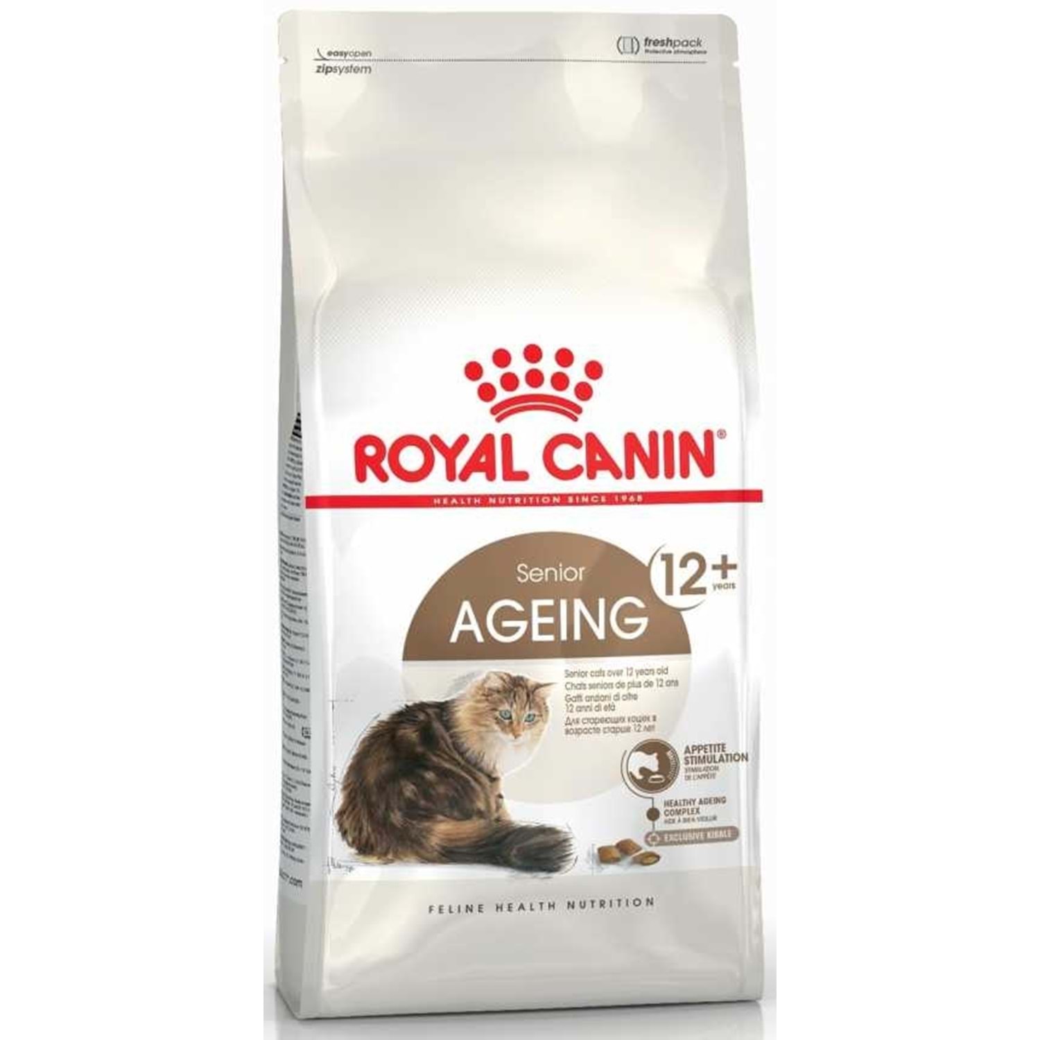 Royal Canin Ageing 12 Yaş Üzeri Yaşlı Kuru Kedi Maması 2 Kg 12 yaş ve üzeri yetişkin kediler için, bağışıklık sistemini güçlendiren, fosfor kontrollü, dışı kıtır içi soft özel mama taneleri olan, kuru mamadır.Ağız ve diş sağlığının korunmasında ve güçlenmesinde yardımcıdır.Mama tanelerinin yapısı yetişkin kedilerin dişleri için uygundur. Üzüm ve yeşil çaydan elde edilen doğal polifenoller ve vitamin E hücre yaşlanmasından sorumlu olan serbest radikallerle savaşa yardım eder. İçerdiği frukto-oligo-sakkarit FOS ile pozitif mikrofloranın desteklenmesi sayesinde ishale sebep olan bakterilerden korumakta, kalsiyumun daha iyi emilmesini sağlamakta, LDL kolestrolün seviyesini düşürmektedir.İdrar pHını dengeleyerek üriner sistemin korunmasına yardımcı olur. İçeriğinde bulunan fosfor duyu organlarının sağlığını korumaya yardımcı olur.İskelet ve eklem yapısını güçlendiren glukozamin ve kondrotin içerir. Mamanın İçeriği; Bitkisel protein izolat, önceden pişirilmiş buğdat unu, hayvansal yağlar, pirinç, hidrolize edilmiş kümes hayvanları eti, bitkisel lifler, hidrolize edilmiş hayvansal proteinler, mısır, hindiba kökü, soya yağı, balık yağı, mineraller, domates, psyllium kabukları ve tohumları, fructo-oligosakkarid, yeşil çay ekstaktı, hidrolize edilmiş yumuşakçalar glukosamine kaynağı, hodan yağı, kadife çiçeği özü, hidrolize edilmiş kıkırdak kondroitin kaynağı Mamanın Analizi; Ham protein 30,00, ham yağ 19,00, kül 5,20, ham lif 4,70, vitamin A 20.100 IU, vitamin D3 700 IU, demir 46 mg, iyodin 3,6 mg, bakır 10 mg, manganez 60 mg, çinko 198 mg, selenyum 0,08 mg. Kuru, serin, böcek ve haşereden uzak bir yerde ve paketin ağzı kapalı olarak saklayınız.Günlük verilecek miktarın birkaç öğüne bölünmesi tavsiye edilir.Mamanın yanında daima taze içme suyu bulundurunuz.Başka bir mamaya geçerken kademeli geçiş süresi uygulayınız.