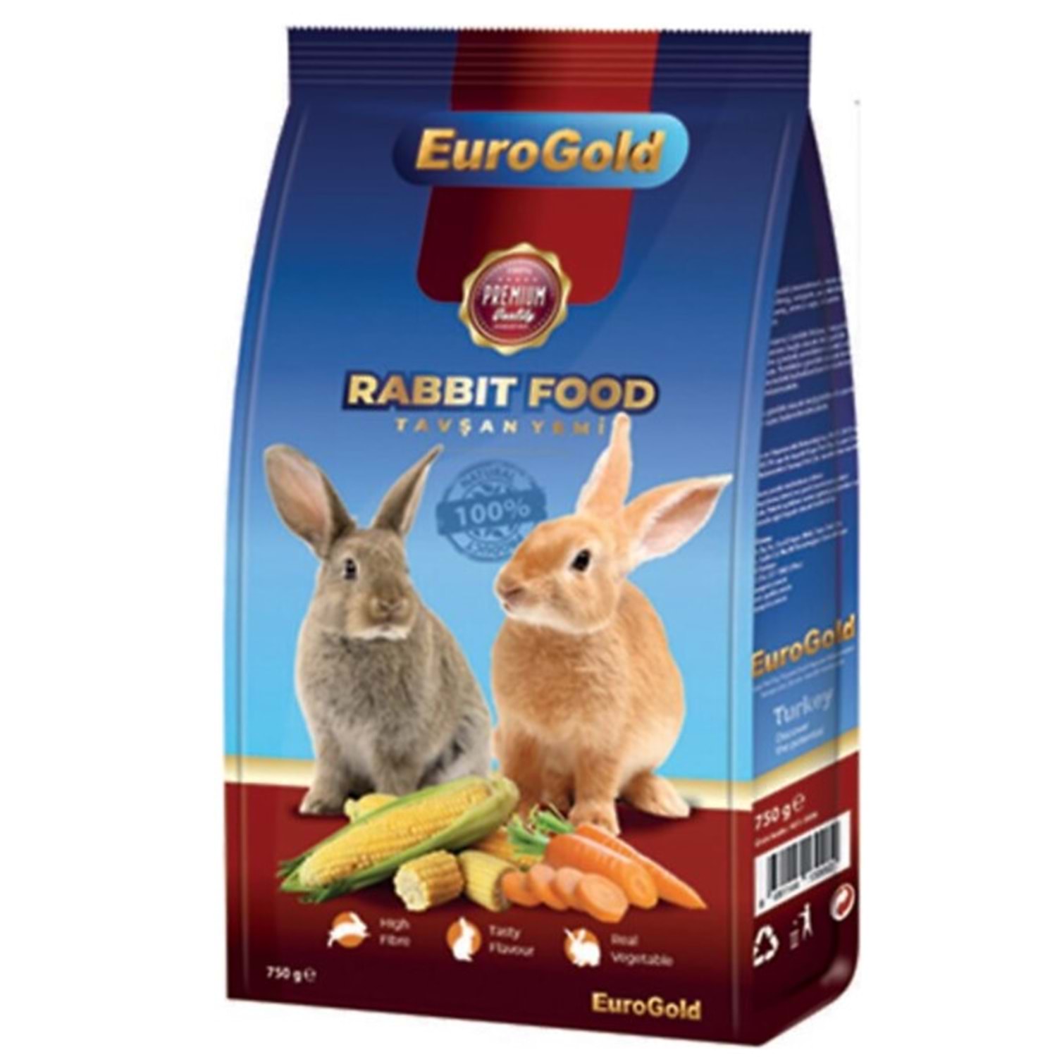 Eurogold Tavşan Yemi 750gr Ürün kodu: 451-3006 Eurogold Tavşan Yemi; tavşanların doğal beslenme alışkanlıklarına uygun olarak hazırlanmış tam yemdir. Bu karışım, en kaliteli tohumların, özel formüle edilmiş pelet yemler ile harmanlanmasından elde edilmiştir. Tavşanların ihtiyacı olan tüm besin maddelerini içeren özel bir yemdir. Tavşanlarda beslenme tek tip değil çeşitli olmalıdır. Kuru yem, sebze, meyve şeklinde çeşitlilik sağlanmalıdır. Beslenmenin %60'ı kuru yem-kuru ot, %25'i sebze, %15'i ise meyve şeklinde bir düzen oluşturulmalıdır. Tavşanların sindirim sistemi yüksek miktarda lif içeren yiyeceklerle beslenmelerini şart koşar. Lifli yiyeceklerin alınması sağlıklarını korumaya ve sindirim sisteminin düzgün çalışmasına yardımcı olur. Bu yüzden Eurogold Tavşan Yemi yüksek lif içerikli kuru otlar ve sindirimi kolaylaştırıcı pelet formülleri içerir. Kuru otları çiğnemeleri hem onları sakinleştirir hem de dişlerinin aşırı büyümesini engeller. Ürün İçeriği; Buğday, arpa, yulaf (mevsimsel), mısır, sorgum, ayçekirdeği, kurutulmuş havuç, yonca sapı, vitamin – mineral karışımı, pellet içerir.
