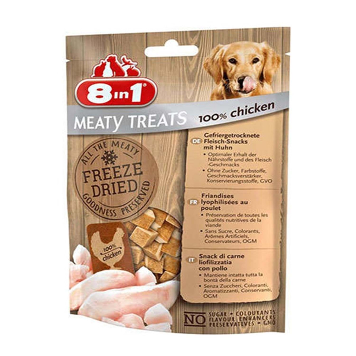 8in1 Freeze Dried Tahılsız Tavuk Havuçlu Kurutulmuş Köpek Ödülü 50 Gr. Dondurularak kurutulmuş etli ödül maması, Tavuk göğsü ve havuç tüm lezzetini ve besleyiciliğini köpeğinizin bayılacağı leziz bir ödül mamasında bir araya getirir.Glutensiz ve tahılsız formül.Az yağ içeren tarif.Köpekler için tamamlayıcı mama.Ürün kullanımı sırasında her zaman taze su bulundurunuz.Ürünü kullandıktan sonra paketi kapatarak taze tutunuz. Bileşimi Tavuk göğüsü %88, Havuç %10 Analitik Bileşenler Protein %75, Yağ içeriği %7, Ham kül %5, Ham selüloz %1,