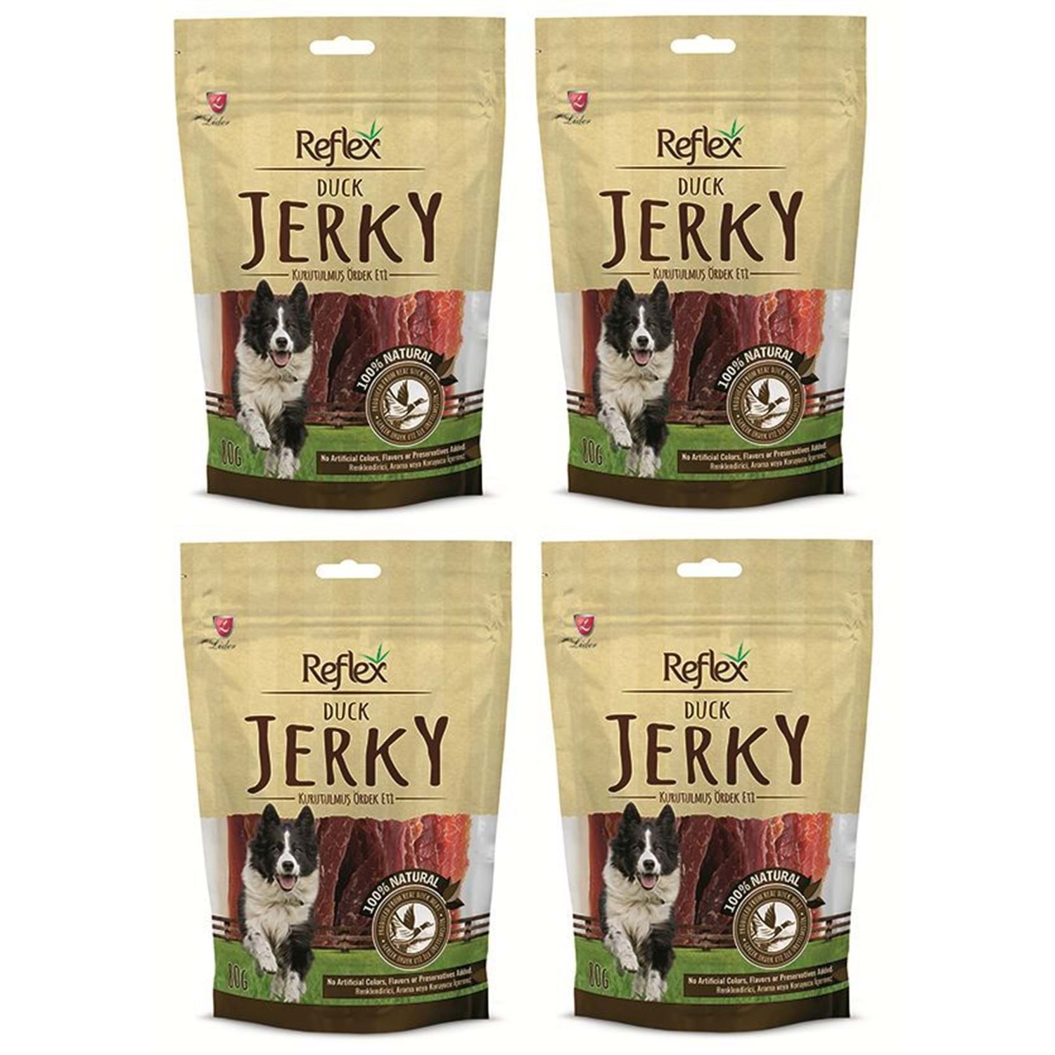 Reflex Ördek Parça Fileto Doğal Köpek Ödülü 80 Gr.x4 Adet İçerik Listesi:Ördek Eti , Sebze Gliserini, Soya Proteini, Nişasta, Tuz. Analiz Değerleri:Ham Protein: Minimum 50%, Ham Yağ 1%, Ham Seluloz 4%,Nem 18%. Bütün yetişkin köpekler için önerilir. Sürekli köpeğiniziçin taze içme suyu bulundurun. Küçük ırk köpekler için ufak parçalaraparçalanıp verilmesi tavsiye edilir. Ödül mamalarını elledikten sonraellerinizi sabunla yıkayınız. İnsan tüketimi için uygun değildir. Serin ve kuruyerde saklayınız.